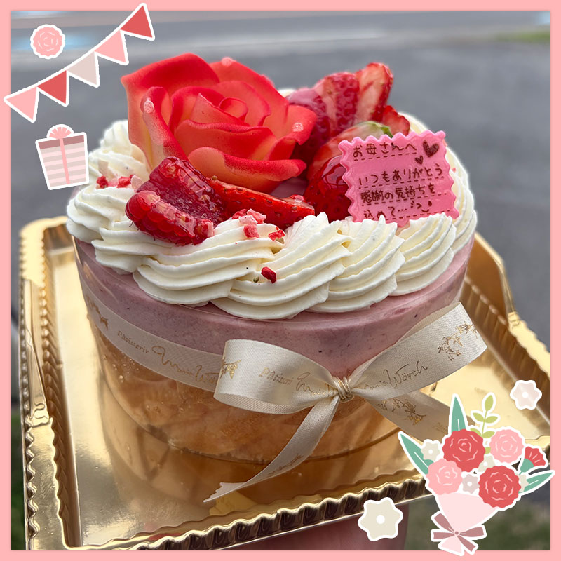 マリアヴェルト特製の生クリームと口当たりの良いスポンジ、カーネーションチョコレートの中に旬の苺をたくさん使用して仕上げた母の日限定のケーキです。カーネーションのように仕立てたチョコ飾りが母の日をより華やかに演出してくれます。