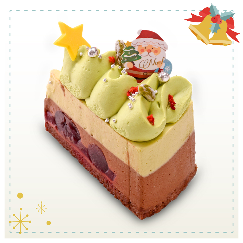 ピスタチオのムース / チョコレートムース / グリオットコンポート / ピスタチオクリーム / グリオットジュレ / チョコスポンジ
