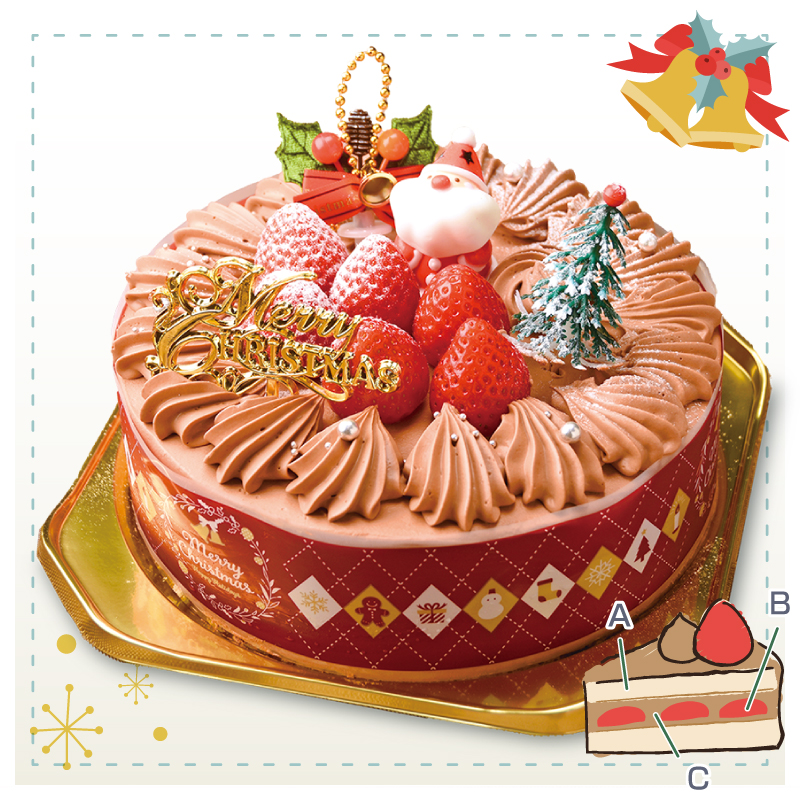 A:ジェノワーズ(スポンジ生地)B:苺C:シャンティショコラ(スイートチョコのガナッシュ使用)