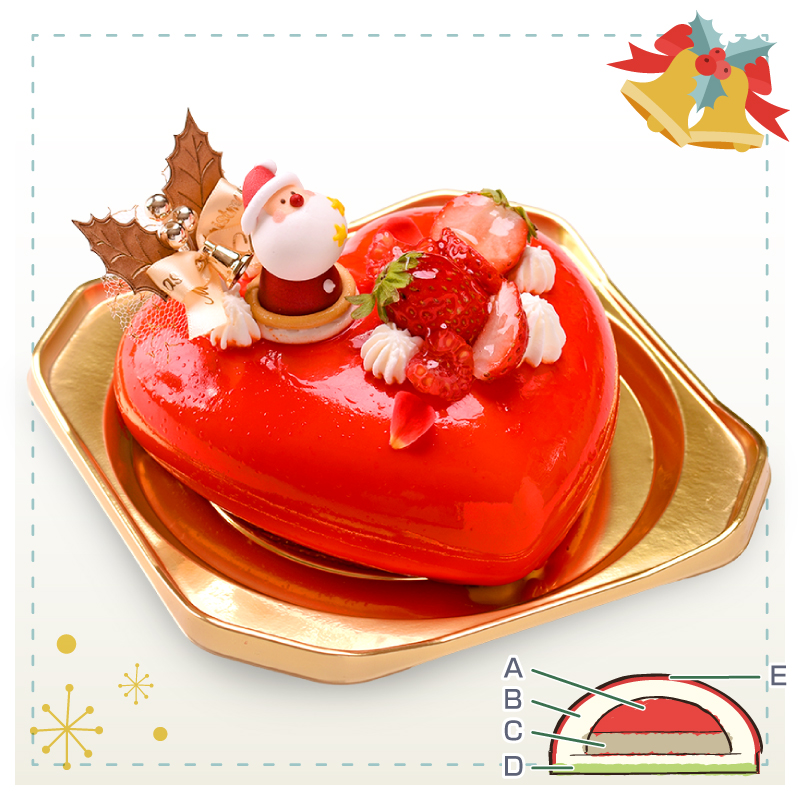 A ローズベリージュレB バニラムースC ライチチョコクリームD ピスタチオスポンジE 赤色上掛け、ジャム状ゼリー