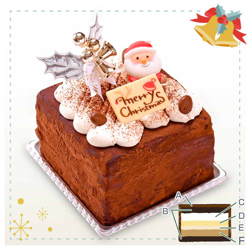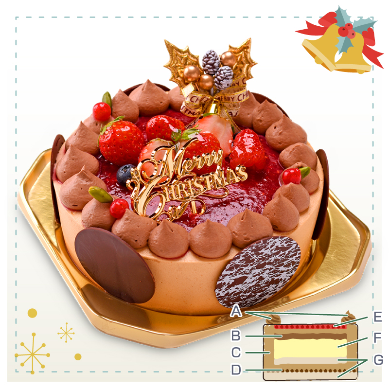 A チョコガナッシュB チョコスポンジC 生クリームD カスタードクリームE プレーンスポンジF チョコクリーム
