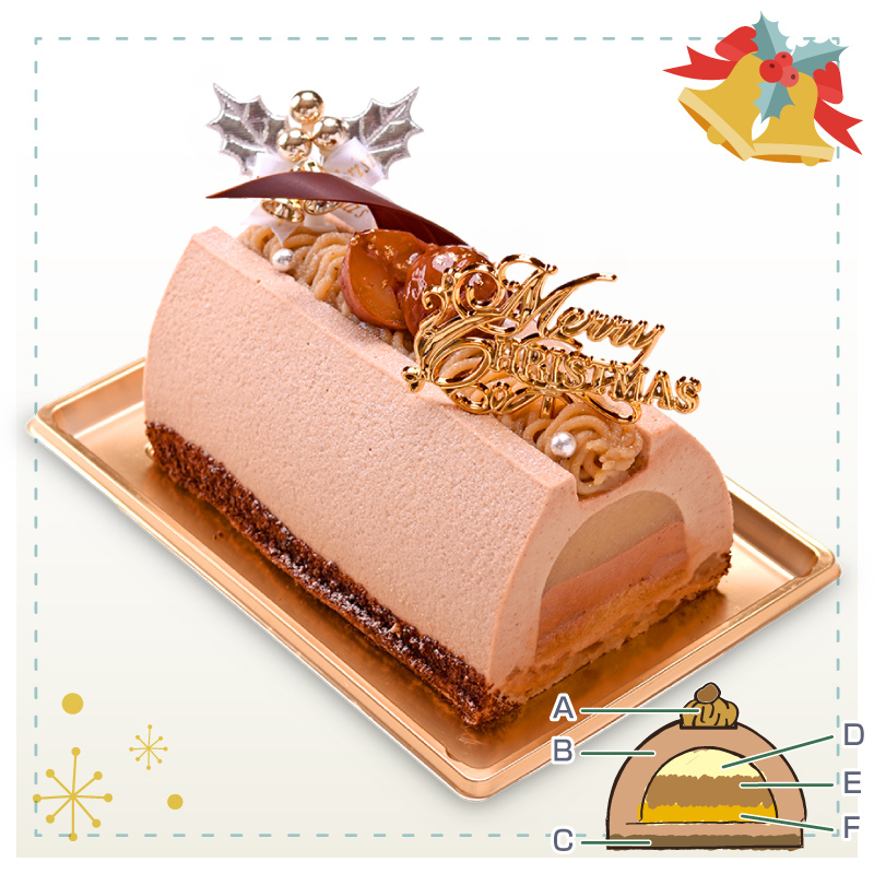 A 和栗ペーストB ムースマロンC くるみのダックワーズD ジュレポワールE ムースキャラメルショコラF ビスキュイキャラメル